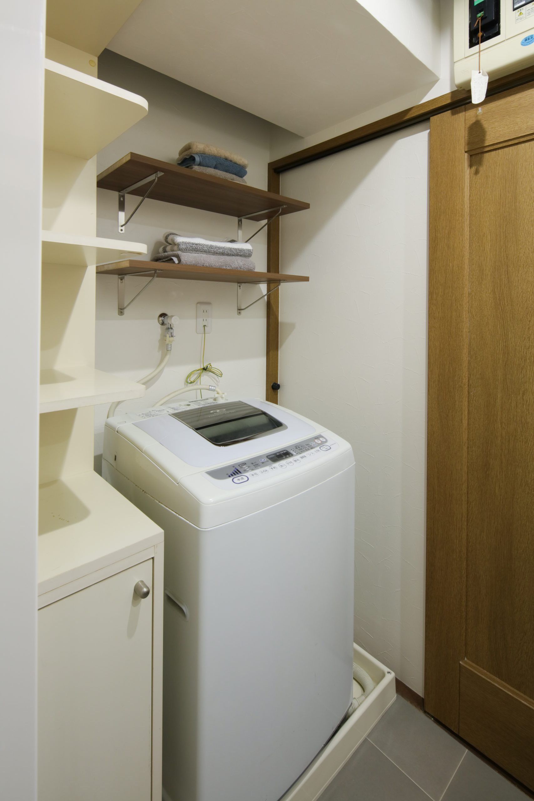 洗面化粧台から造作洗面台に取替え、垂れ壁撤去、システムバス取替え、クロス貼替え、床張替え、収納棚設置 -