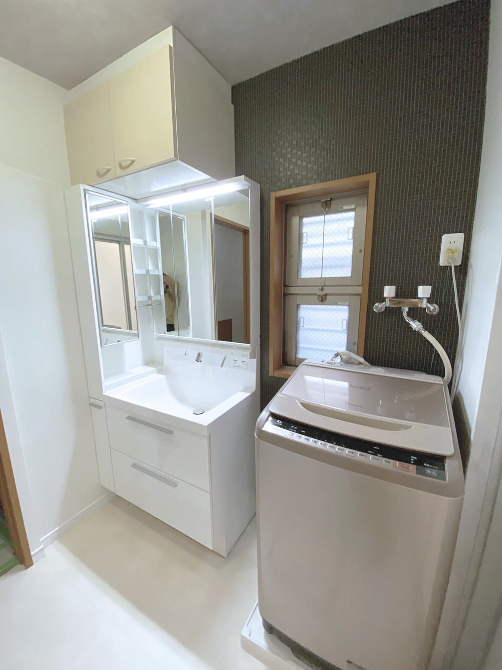 収納力のあるトールキャビネット付きの洗面化粧台を設置しました。