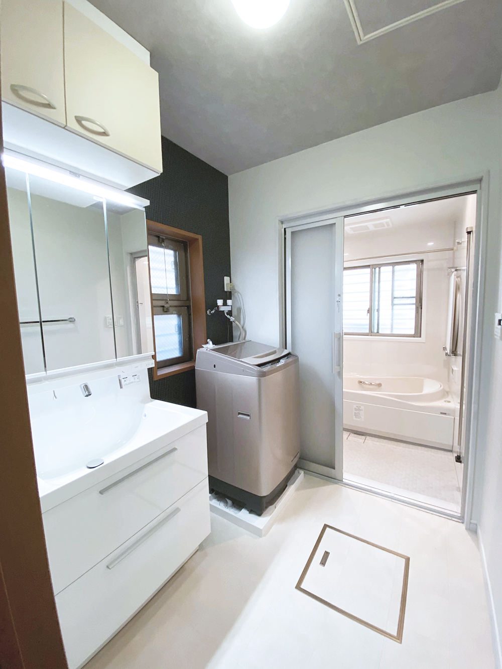 洗面化粧室を広くしたいというご希望でしたので、使い勝手に不満のあった埋込収納スペースを撤去し、洗面化粧室を拡張。