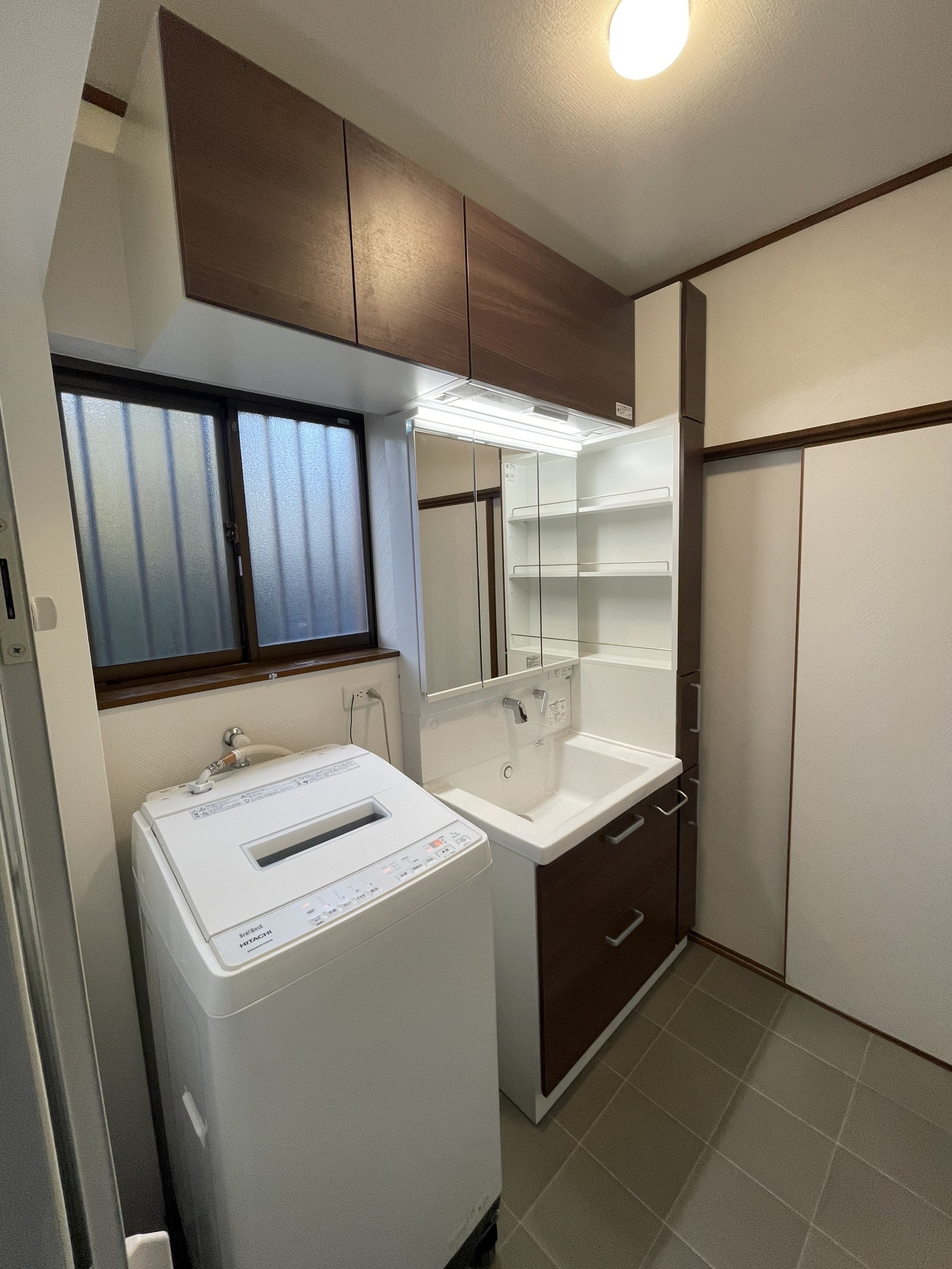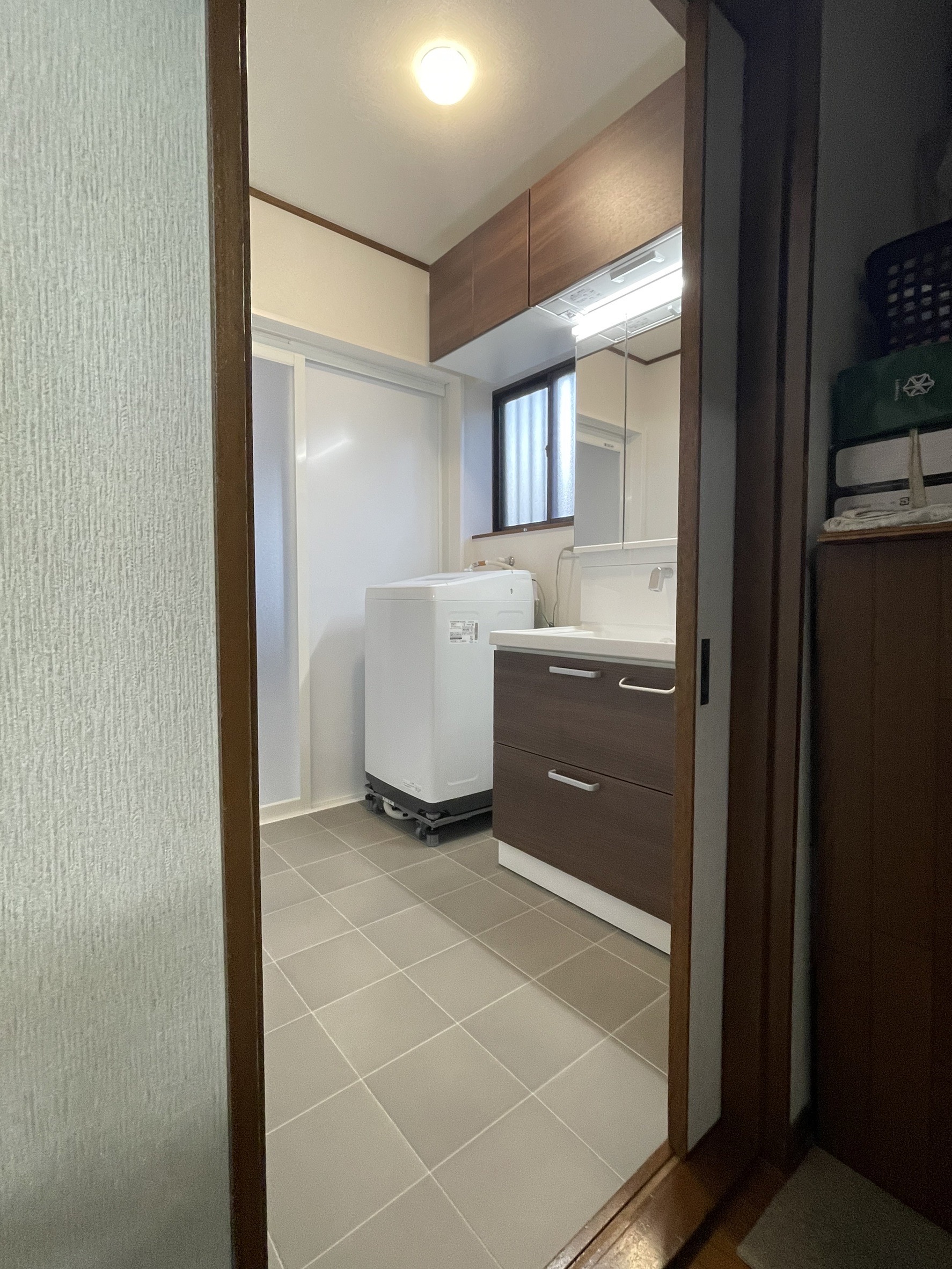床張替え(LDK・洗面)、クロス貼替え(LDK・洗面)、可動棚造作、在来浴室からシステムバスに取替え、浴室暖房乾燥機設置、浴室ドア取替え、浴室と洗面脱衣室との段差解消、洗面化粧台取替え、コンセントの位置替え、洗濯機用水栓の交換、洗濯機排水口の位置替え、内窓設置(6ヶ所) -