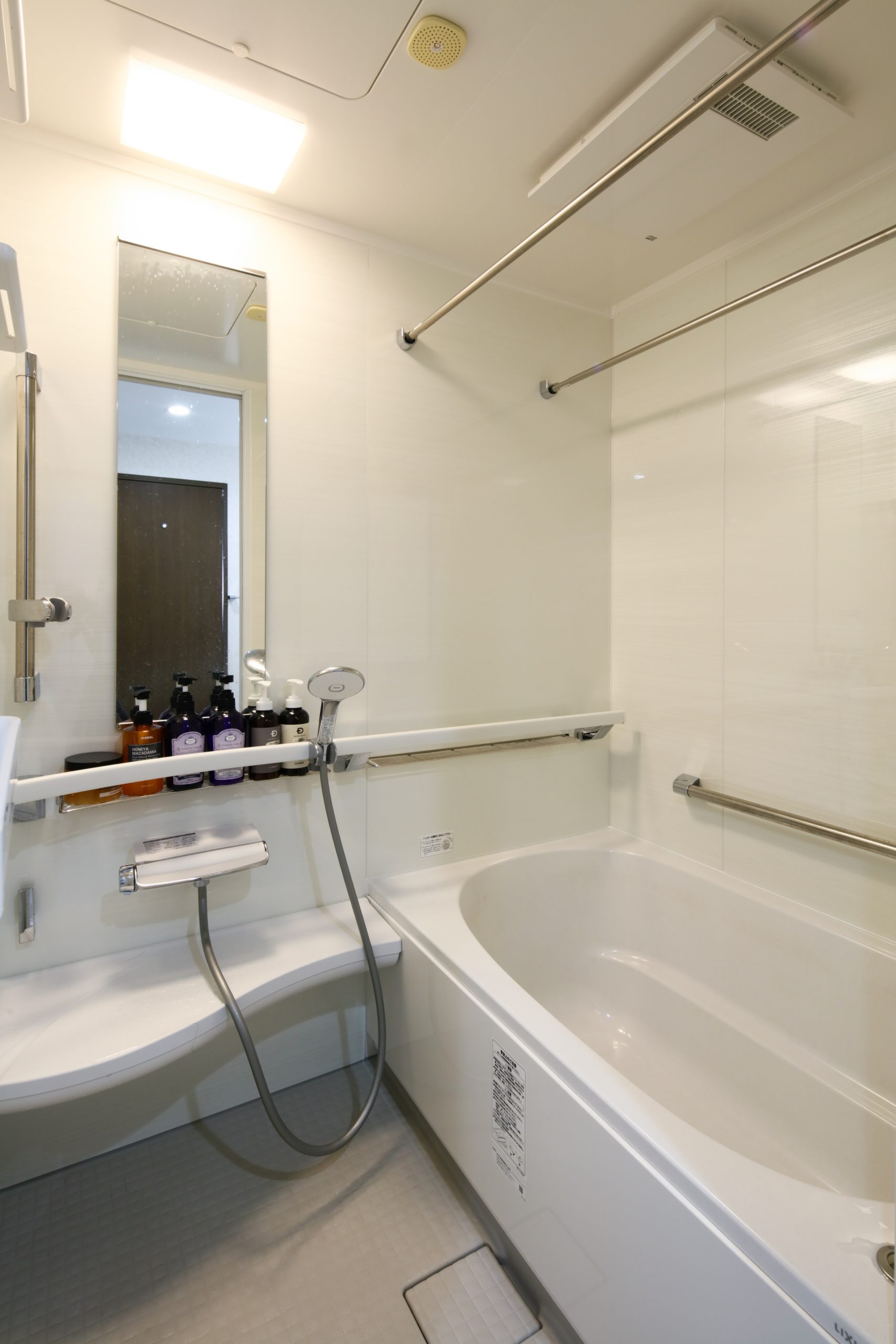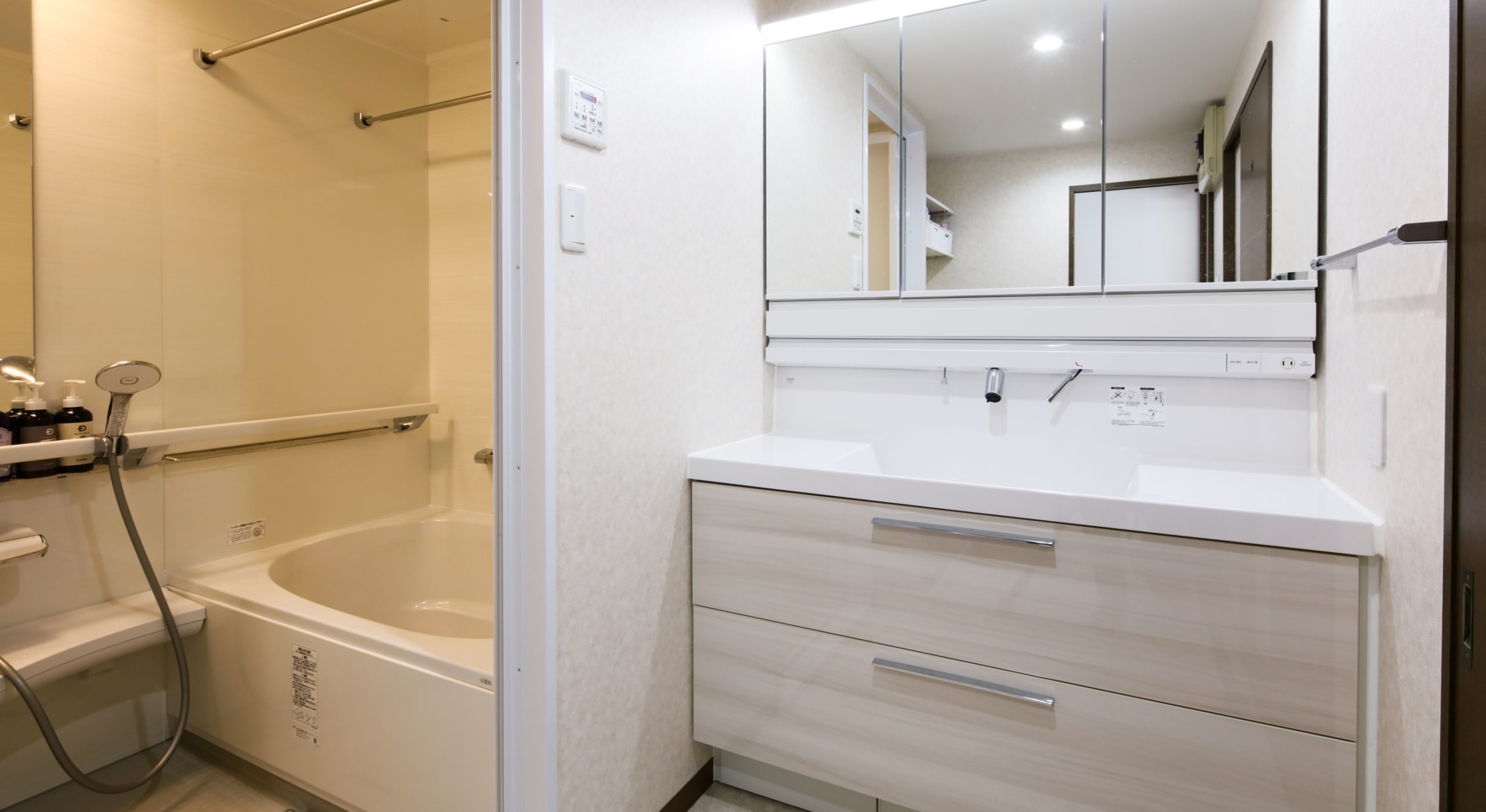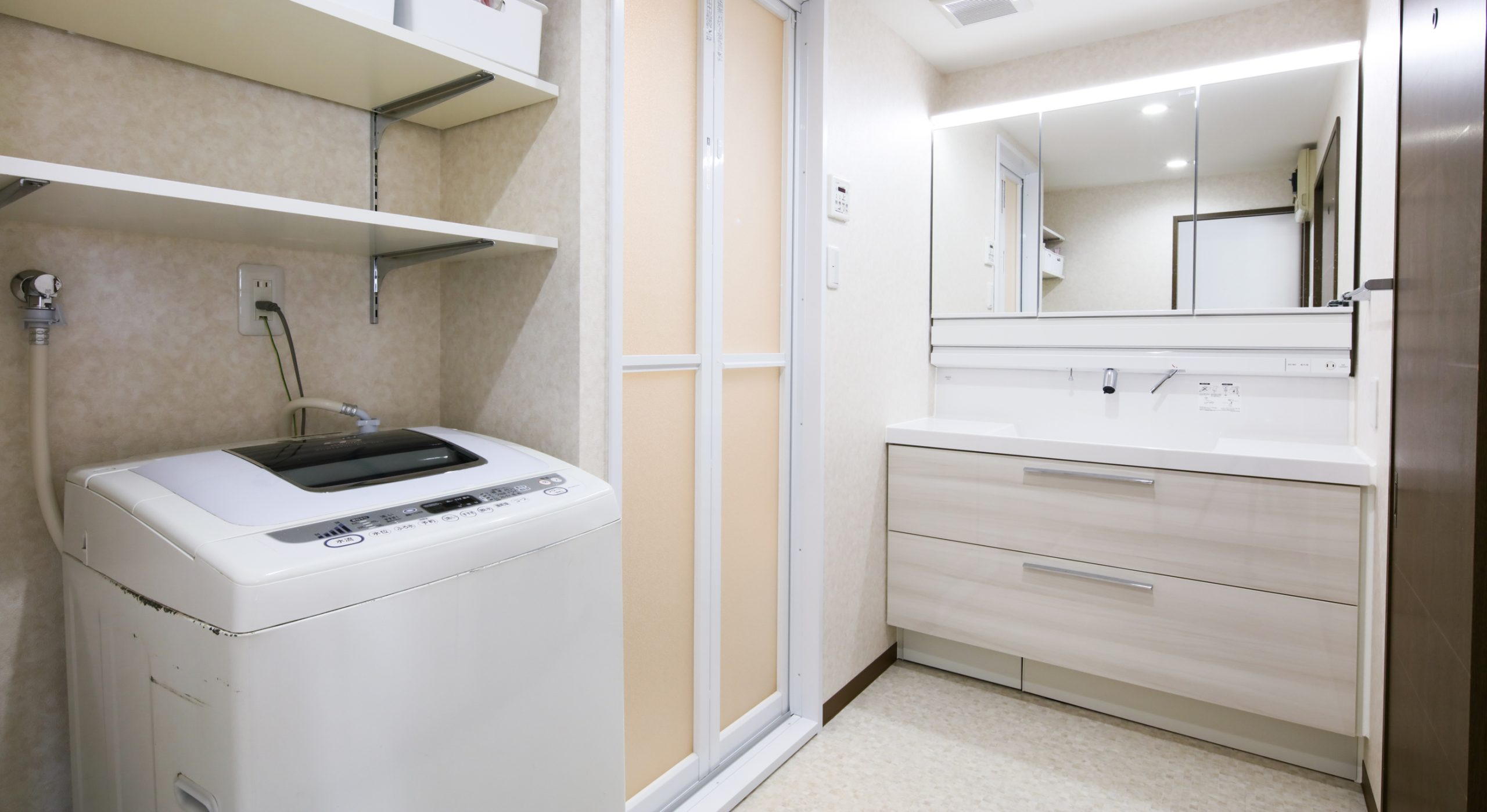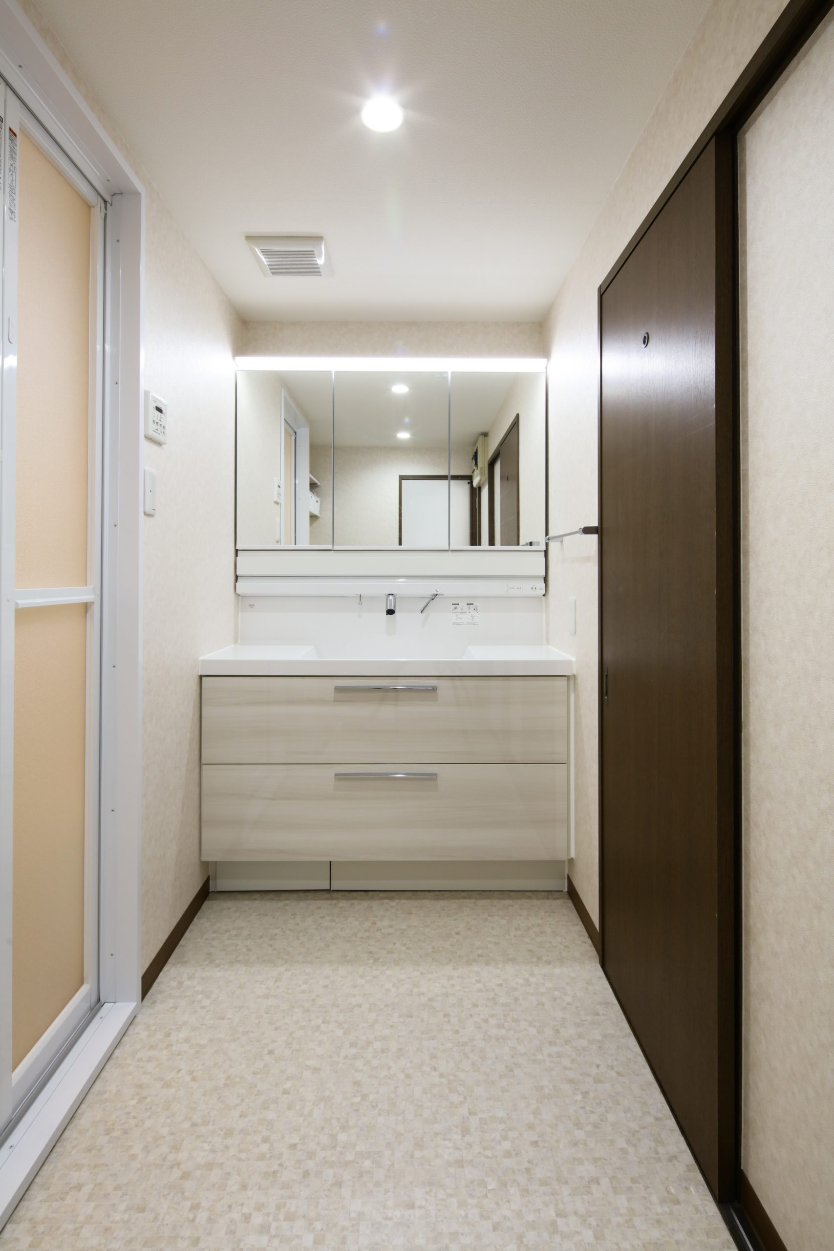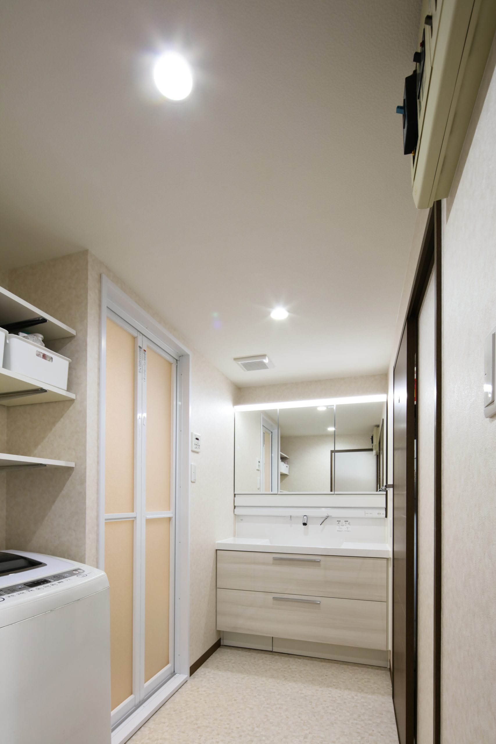 洗面脱衣室は、収納力のあるワイドサイズの洗面化粧台と照明を2つ設置し、明るく広々とした空間に仕上げました。