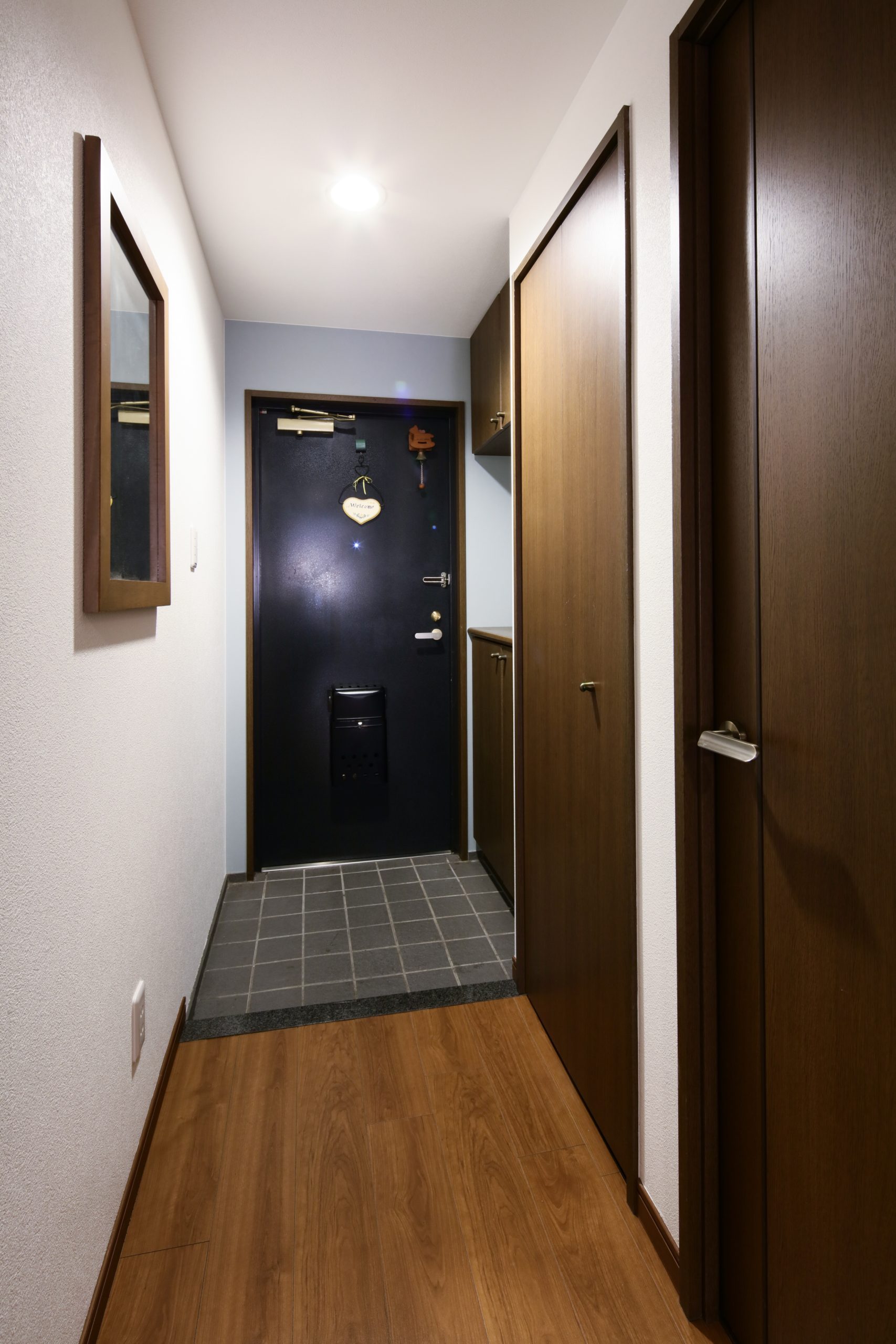 玄関にも同じアクセントクロスを使うことで、毎日のお出かけの気分も上がります。